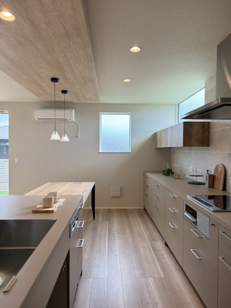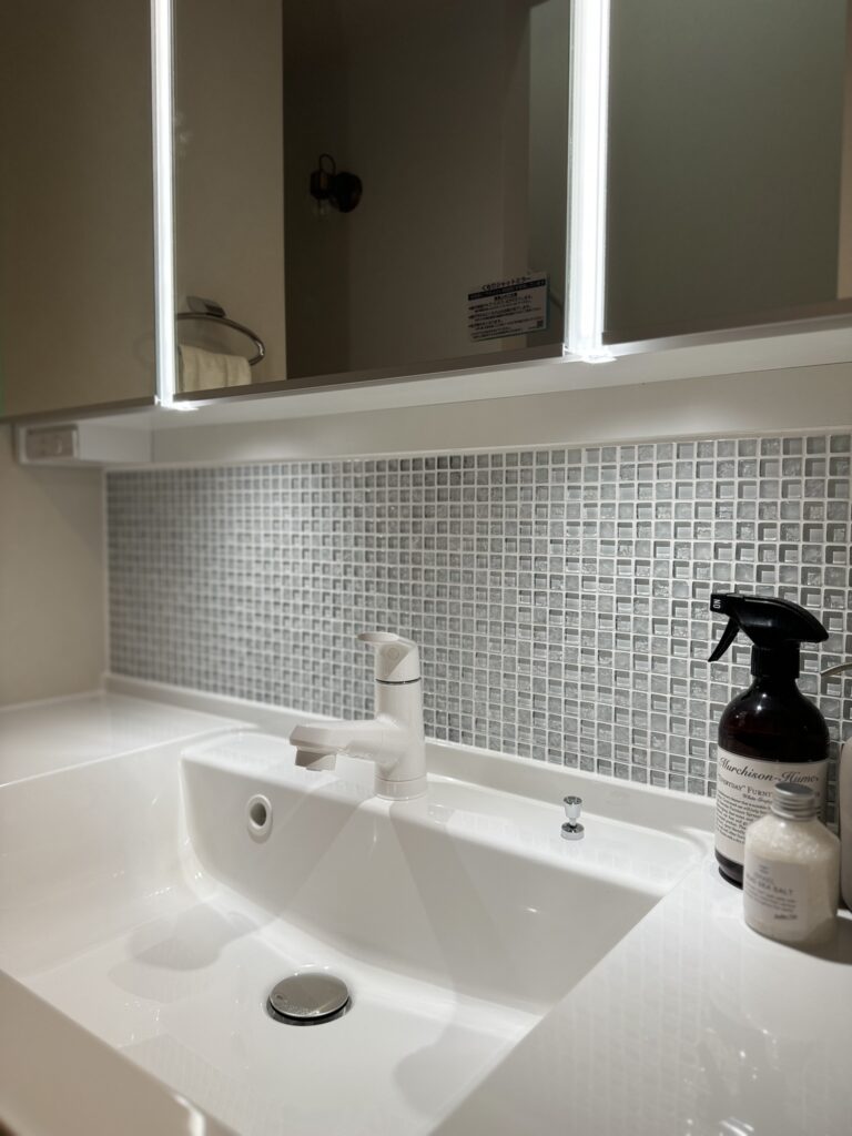 真鍮のアイテムをメインに、グレージュのクロスやフローリング、淡い色味のインテリアで仕上げました。